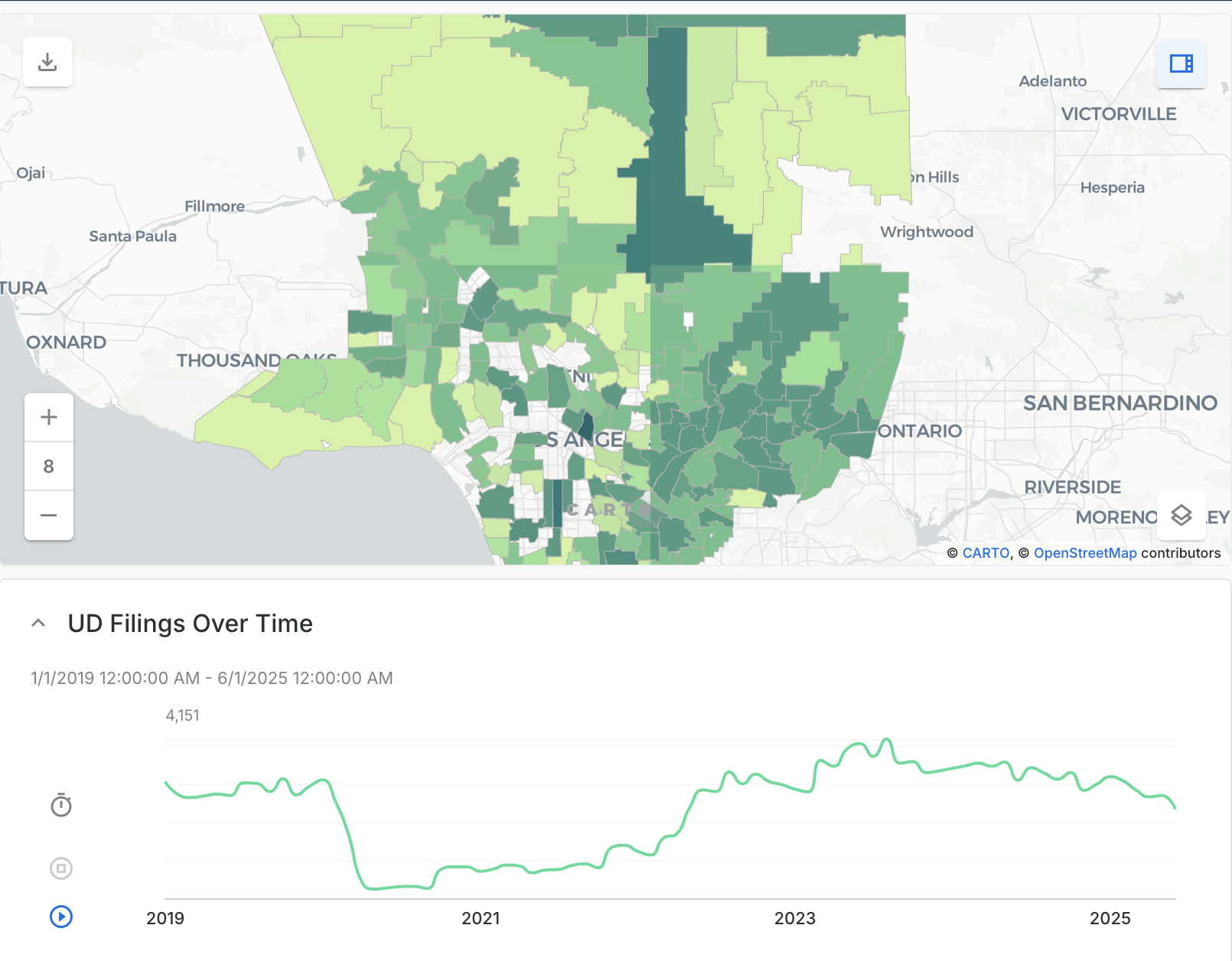 This is especially important in Los Angeles County, a region that is home to approximately 5 million renters in an area larger than Delaware and Rhode Island. As this map shows, however, evictions are not randomly distributed across the county - they’re concentrated in neighborhoods in Downtown LA, Southeast Los Angeles, and the Antelope Valley.